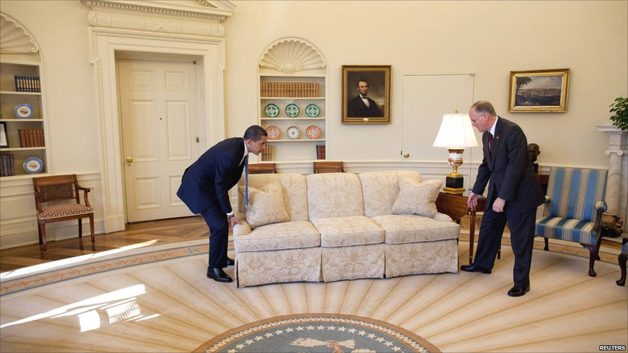 小布什使用過(guò)的舊座椅被收進(jìn)了白宮庫(kù)房,奧巴馬換上了辦公室風(fēng)格的新座椅。另外,邱吉爾的銅質(zhì)頭像也被馬丁-路德-金的頭像取代。