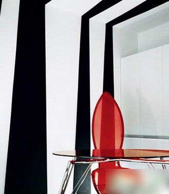 條紋的天花和墻壁已經(jīng)非常有特點,天花上綻開的一條曲線燈帶加強了波普式的摩登和俏皮,并且使得燈光看起來似乎在天花板上游動起來,一個小小的改變有時會收到雙倍效果。 |